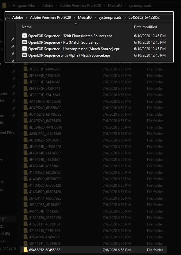 BUT! I noticed you could import a preset, and these appeared to be the same presets Premiere uses in the exporter. Ah, think I, if one can save a preset to a file, then the existing presets in this list must also be files somewhere. Turns out they’re deep in this labyrinth of mysteriously named directories (see image). Spoiler: the EXR ones are at the end. Just start there.