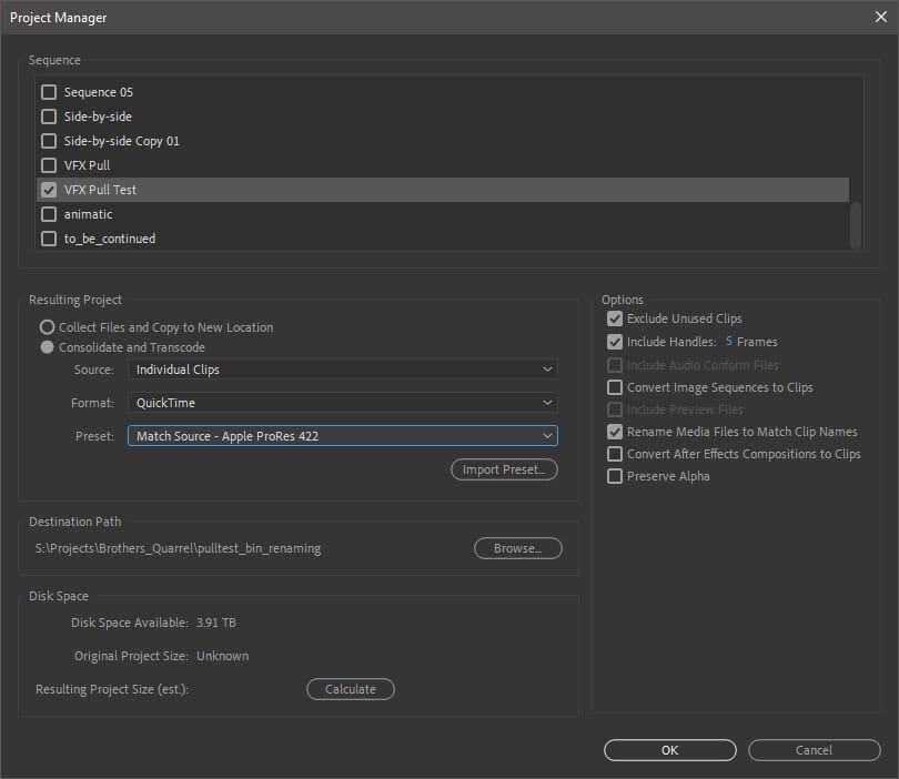 There had to be a better way. And I found one… kind of. Turns out Premiere has a Project Manger that can do something I’ve been wanting, namely render handles of any length. There are a few “gotcha’s” though. For one, this tool is meant for archiving. It’s designed so that you can save the source media you absolutely need in order to keep this project renderable, while being able to trash all the original stuff to save space. It does this by re-exporting each clip in your timeline(s) to a format meant for editing, such as ProRes or DNxHD. No EXR or image sequence options. I mean, why would there be? You don’t edit in those formats.