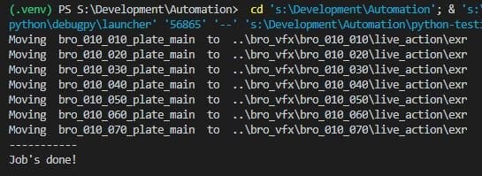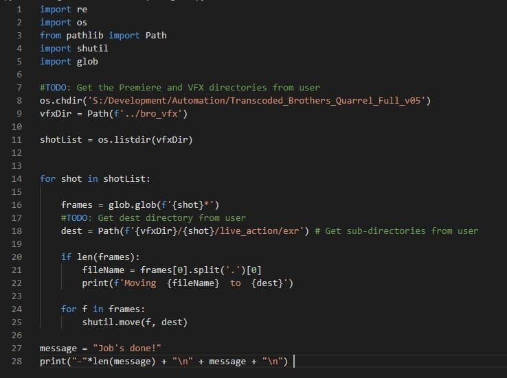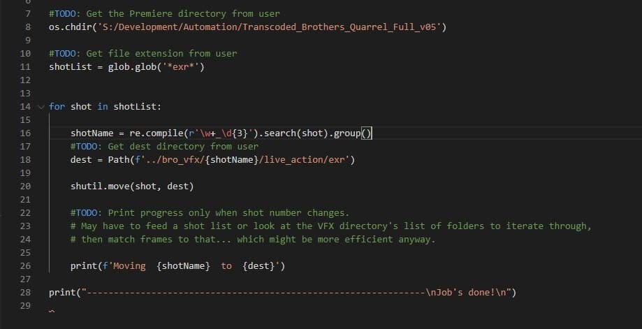 I figured if I only wanted something printed out when the shot number changed, then the easiest way would be to iterate through a list where the shots only appear once. So I flipped everything on its head and used the VFX directory as my list. I then used the glob module to find all files that contain the folder’s name, which itself returns a list of matches. I could then just iterate through that list and move those frames to where they need to go. So just one line of code being repeated the most, rather than four.