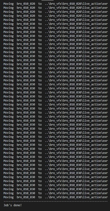 As you may also note, I sort of worked out the logic of what I should be doing instead, and immediately set off to create that. This initial version was looking at the folder full of EXR files and then iterating over every single one of them, using a regular expression to extract the shot name and then move it to where it needed to go. This meant printing any sort of feedback would happen on every single frame. It also meant running a chunk of code on every single frame.
